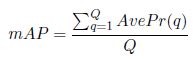 mAP (Mean Average Precision ): Dado un conjunto de imágenes de consulta esta métrica se define como,