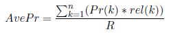 donde k es el rango en la secuencia de imágenes recuperadas, n es el número de imágenes recuperadas, P r(k) es la precisión en k en la lista (P r@k), rel(k) es una función que toma valor 1 si la imagen con rango k es relevante o 0 de otro modo y R es el número de imágenes relevantes (Napoletano, 2018).