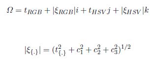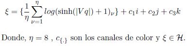 Donde, Ω ∈ H, t{.} y |ξ{.}| , son la parte real y módulo del quaternion respectivamente en los diferentes espacios de color.