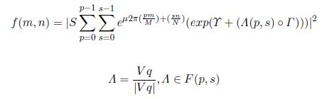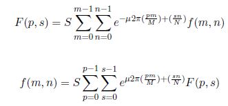 la exprsión (9) and (10) son la directa e inversa de la transformada de Fourier para quaternions respectivamente, µ un quaeernion puro unitario, p y s son los coeficientes; de frecuencias, m y n son las coordenadas espaciales de la imagen.