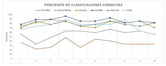 El porciento de clasificaciones correctas (%CC) es el índice que especifica la cantidad porcentual de interesados clasificados correctamente. En la Figura 1 se muestra una comparación entre todos los algoritmos genéticos implementados respecto al porciento de clasificaciones correctas.