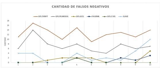 La cantidad de falsos negativos (CFN) es el índice que se refiere la cantidad de interesados clasificados en una categoría inferior a la categoría que en realidad pertenecen. Este índice indica cuántos interesados tienen más prioridad que la que le determinó el sistema. En la Figura 3 se muestra una comparación entre todos los algoritmos genéticos implementados respecto a la cantidad de falsos negativos.