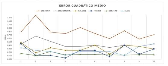 El error cuadrático medio (MSE por sus siglas en inglés) es la medida de dispersión que calcula la diferencia entre cada clasificación y el promedio general. En la Figura 4 se muestra una comparación entre todos los algoritmos genéticos implementados respecto al error cuadrático medio.