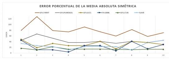 El error porcentual de la media absoluta simétrica (SMAPE por sus siglas en inglés) es la medida de dispersión que calcula el tamaño del error de clasificación en términos porcentuales. En la Figura 5 se muestra una comparación entre todos los algoritmos genéticos implementados respecto al error porcentual de la media absoluta simétrica.