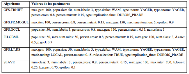 En este trabajo se realiza una comparación de seis técnicas con diferentes enfoques como son los algoritmos genéticos y los basados en particiones del espacio de búsqueda. Entre todos los algoritmos analizados en esta investigación, el algoritmo FH.GBML obtuvo mejores resultados que el resto. Esto sugiere que el sistema genético híbrido de aprendizaje cooperativo-competitivo y enfoque Pittsburgh es una buena estrategia a implementar en problemas de clasificación que utilicen un sistema basado en reglas borrosas.