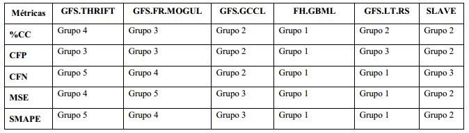 Como se puede apreciar en todas las métricas, el sistema genético híbrido de aprendizaje cooperativo-competitivo y enfoque Pittsburgh (FH.GBML) presenta mejores resultados que el resto de los algoritmos genéticos aplicados. Estos resultados concuerdan con lo expresado en (Rodríguez y Verdecia, 2015) donde se analizan varias técnicas para el aprendizaje de reglas borrosas orientado a la evaluación de proyectos.