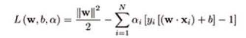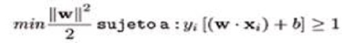 Donde cada muestra (xi ,yi ) para i=1…N está formado por un vector de n características xiϵ Rn y a una etiqueta yiϵ R que indica la clase {±1} a la que pertenece cada muestra. El objetivo es encontrar la función f: Rn → {±1} que separe los datos en dos clases y que clasifique correctamente nuevas muestras perteneciente al conjunto de pruebas.