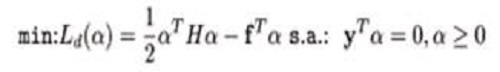 donde se utiliza el vector unitario f= [11…1]T y mediante cualquier método de optimización se halla el vector de multiplicadores α0 = (α01,α02,α03…α0N) para finalmente determinar el vector normal w0 y el bias b0 del HSO