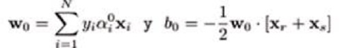 esto indica que w0 se puede expresar como combinación lineal de N vectores de entrada. De las condiciones KKT se desprende que gran parte de los multiplicadores de Lagrange α0 son cero, por lo que una menor cantidad de vectores del conjunto de entrada Nsv participan de la combinación lineal que origina a w0: los vectores de soporte. En la expresión anterior Xr y Xs son un par de vectores soporte, uno de cada clase. La expresión final del clasificador buscado finalmente seria