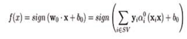 donde el signo resultante indicará la clase a la cual pertenece un dato determinado. Nótese que la sumatoria no se realiza sobre todos los puntos de entrenamiento N, sino sobre los que son vectores soporte (SV) siendo el número de estos por lo general mucho menor.
