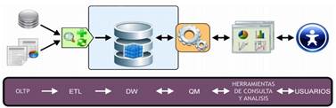 ETL: los ETL extraen datos de las diversas fuentes que se requiera, los transforma para resolver posibles problemas de inconsistencias entre los mismos y finalmente, después de haberlos depurado se procede a su carga en el DW. Estos procesos permiten manipular, integrar y transformar los datos, para posteriormente cargar los resultados obtenidos en el DW.