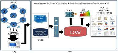 La arquitectura para el sistema de gestión y análisis de los datos recolectados por una WSN, está basada en un DW. Esta propuesta se sustenta en la necesidad de modificar, optimizar y generar métodos y modelos de almacenamiento y tratamiento de grandes volúmenes de datos generados por una WSN.