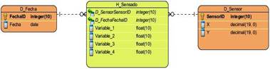 El modelo lógico del DW se observa en la Figura 3. Este se basa en un modelo de esquema estrella. Se define una tabla de hechos llamada H_Sensado que contiene todas las mediciones realizadas a través de la WSN, y claves externas de las tablas de dimensiones D_Fecha y D_Sensor. La tabla dimensión D_Fecha contiene datos del instante de tiempo en el que fue realizada la medición, y D_Sensor presenta los datos del sensor que realiza esta medición.