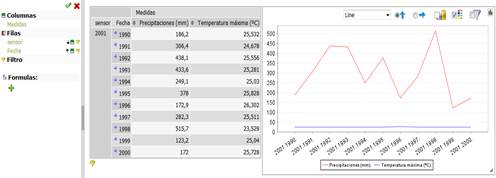 La Figura 4 ilustra el comportamiento de las precipitaciones y la temperatura máxima registrada por el sensor 2001 desde el año 1990 hasta el año 2000, pudiendo evidenciarse las diferencias en los valores de precipitaciones entre los años, sin embargo, la temperatura máxima promedio presenta valores similares en estos 10 años. Entre las facilidades proporcionadas por StPivot para realizar este tipo de análisis, se encuentra la posibilidad de mostrar gráficos de distintos modelos. De esta forma el usuario puede comprender mejor la información, visualizada desde distintas perspectivas.