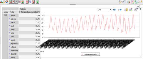 Otra de las funcionalidades de StPivot consiste, en que a partir de las consultas realizadas al DW, permite construir series temporales. Mediante las cuales es posible conocer el comportamiento de un indicador en un periodo de tiempo determinado, utilizando los intervalos de tiempo que defina el usuario y exportar en formato XLS esta información, como se observa en la Figura 5. Donde se construye una serie tiempo de 19 años con intervalos mensuales, que describe el comportamiento de la temperatura promedio registrada por el sensor 2003.
