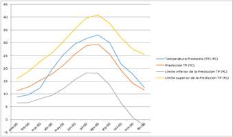El 100% de los valores reales de temperatura promedio mensual, se encuentra entre los valores concebidos el intervalo de confianza establecido en el pronóstico realizado. Se puede observar además la similitud existente entre los valores reales y los valores pronosticados.