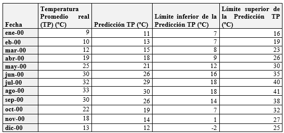 Los resultados de la predicción realizada por la herramienta Pronóstico de Microsoft Excel 2016 a partir de la serie temporal construida por StPivot y su comparación con los datos reales de temperatura promedio mensual, registrados por el sensor 2003 en el año 2000, pueden observarse en la Tabla 1.