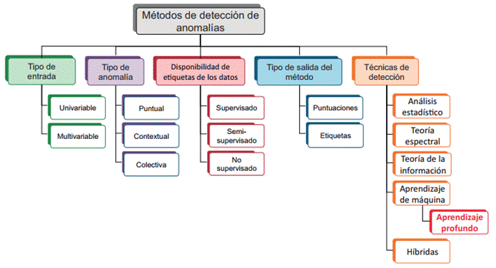 Los métodos de detección de anomalías pueden ser clasificados acorde a la naturaleza de la entrada, el tipo de la anomalía, el etiquetado de los datos, o el tipo de salida que devuelve el método (Chandola et al., 2009; Baddar et al., 2014). La entrada de estos métodos es una colección de instancias (objetos, registros, puntos, patrones, entre otros) (Tan et al., 2005) la cual puede ser univariable o multivariable (Chandola et al., 2009). Los tipos de anomalías son tres, puntuales, contextuales y colectivas (Chandola et al., 2009; Baddar et al., 2014; Parmar and Patel, 2017). Dependiendo del grado de disponibilidad de las etiquetas, los métodos de detección de anomalías también se pueden clasificar en uno de los tres modos siguientes: detección de anomalías supervisadas, semi-supervisadas y no supervisadas (Chandola et al., 2009). Otra forma pudiera ser según la forma de retornar la anomalía detectada, usualmente, se hace en forma de puntuaciones o etiquetas (Chandola et al., 2009). Por último, una de las clasificaciones más comunes es de acuerdo con las técnicas utilizadas para la detección de anomalías, tales como análisis estadístico, aprendizaje automático, teoría de la información y teoría espectral, entre otras (Chandola et al., 2009; Baddar et al., 2014). En busca de una mejor asimilación de lo antes mencionado, en la Figura 2 se muestra una distribución de las clasificaciones para los métodos de detección de anomalías.