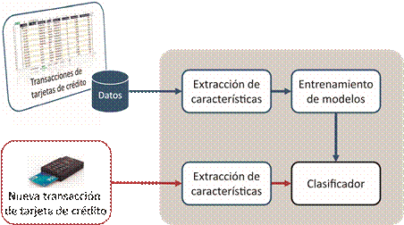 Un flujo de funcionamiento para los métodos de detección de anomalías parte de un conjunto de datos, los cuales son representados de la forma más adecuada para su análisis, llámese extracción de características. Con estas nuevas representaciones se hace el análisis de los datos y entrenamiento de los algoritmos para que sean capaces de discriminar entre datos anómalos y normales. Estos modelos entrenados son capaces de discriminar nuevos datos en un futuro. En la Figura 3 se muestra un ejemplo de este flujo de funcionamiento tomando como datos transacciones de tarjetas de créditos.