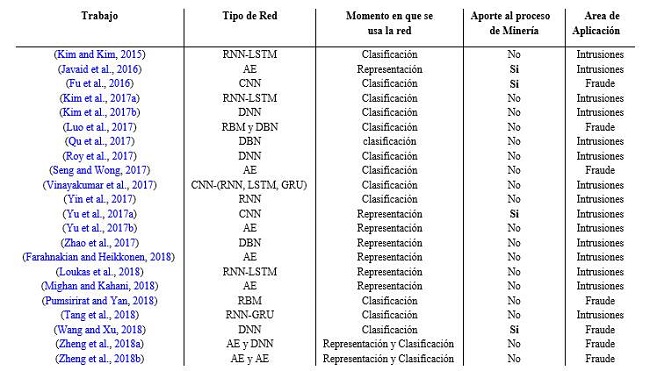 En la literatura, como se describieron brevemente en la sección anterior, se han reportado numerosos trabajos donde se han dado evidencias del uso de los diferentes tipos de redes neuronales profundas para la detección de anomalías (Javaid et al., 2016; Yu et al., 2017b; Seng and Wong, 2017; Pumsirirat and Yan, 2018; Zheng et al., 2018b,a; Fu et al., 2016; Luo et al., 2017; Yu et al., 2017a; Farahnakian and Heikkonen, 2018; Mighan and Kahani, 2018; Roy et al., 2017; Kim et al., 2017b; Zhao et al., 2017; Qu et al., 2017; Vinayakumar et al., 2017; Loukas et al., 2018; Wang and Xu, 2018; Yin et al., 2017; Tang et al., 2018; Kim and Kim, 2015; Kim et al., 2017a). En estos trabajos se pudo observar el uso de las redes neuronales profundas para tareas como la reducción de dimensionalidad y/o la representación de los datos y además como clasificador para la detección de anomalías, ya sea como fraudes en redes bancarias o ataques de intrusiones en redes de tráficos de datos.