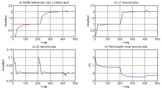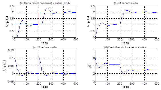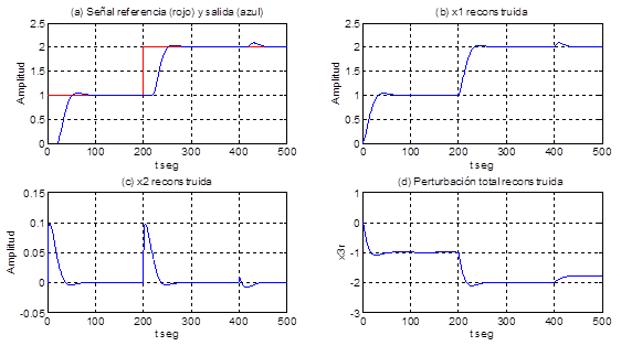 Se observa en la Figura 9 (para los mismos valores de los parámetros del proceso y del predictor de Smith) a) la señal de referencia y la salida de la planta, en b) la salida x1 reconstruida, en c) la salida de la planta x2 reconstruida, en d) la perturbación total; se aprecia en la figura a que el control es capaz de lograr un seguimiento asintótico de la señal de referencia con un sobrepaso menor que el 5% y el tiempo de establecimiento en menos de 65 segundos, en la figura b se observa que la señal x1 reconstruida es aproximada a la señal de salida de la planta, y en la figura c se aprecia que a los 400 segundos hay una perturbación que influye en el proceso con 0,2 unidades y el control es capaz de eliminar su efecto en menos de 50 segundos.