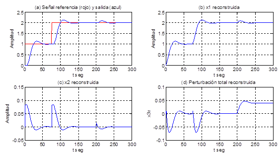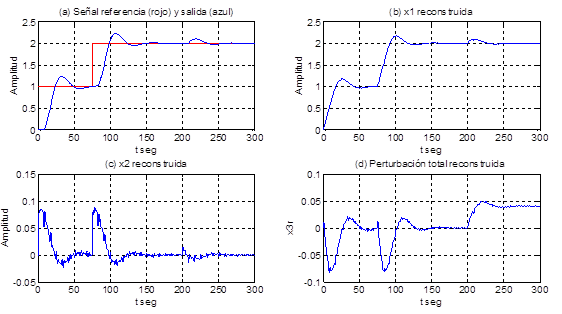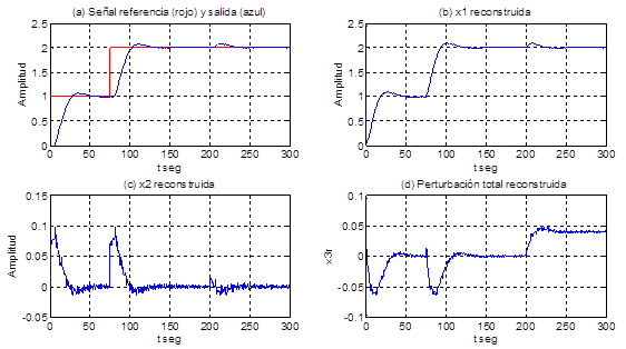 Se observa en la Figura 6 (para los mismos valores de los parámetros del proceso y del predictor de Smith) a) la señal de referencia y la salida de la planta, en b) la salida x1 reconstruida, en c) la salida de la planta x2 reconstruida, en d) la perturbación total; se aprecia en la figura a que el control es capaz de lograr un seguimiento asintótico de la señal de referencia con un sobrepaso menor que el 10% y el tiempo de establecimiento en menos de 50 segundos, en la figura b se observa que la señal x1 reconstruida es aproximada a la señal de salida de la planta, y en la figura c se aprecia que a los 200 segundos hay una perturbación que influye en el proceso con 0,04 unidades y el control es capaz de eliminar su efecto en menos de 50 segundos.