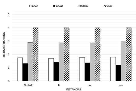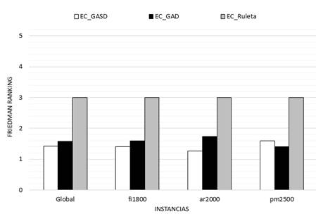 En la Figura 4 se muestra una gráfica de los resultados obtenidos al aplicar el Test de Friedman. El p-valor en todas las instancias y de forma global fue igual a 0, por lo que es menor que 0.05 y se rechaza la hipótesis nula. Ello implica que sí existen diferencias significativas entre los comportamientos de los algoritmos. Según el ranking que ofrece el test de Friedman, la combinación EC_GASD fue el mejor algoritmo en las instancias fi1800, ar2000 y EC_GAD fue mejor en la instancia pm2500. De forma global el algoritmo EC_GASD fue el de mejor rendimiento.