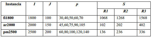 La p representa el 30, 40, 50, 60 y 70 % de J. En la Tabla 1 se muestra la descripción de los diferentes elementos de las instancias. Para la experimentación con el algoritmo Escalador de Colinas se realizaron 30 ejecuciones y 10000 iteraciones, para todas las instancias.