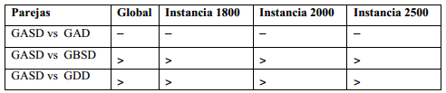 El resultado obtenido en la Tabla 2 muestra que el GASD se comportó mejor que el GDD y GBSD de forma global ya que el p-valor es menor que 0.05, por tanto, se rechaza la hipótesis nula y sí existen diferencias significativas entre los comportamientos de los algoritmos. Hay que destacar que el algoritmo GASD en esta prueba tuvo un comportamiento similar al algoritmo GAD en todas las instancias y de forma global donde no hubo diferencias significativas.