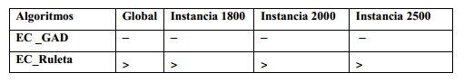 En la Tabla 3 se muestran los resultados de los post-hoc Holm, Finner y Li para todas las instancias, donde se compara el algoritmo que mejor ranking obtuvo de forma global en la prueba de Friedman, el EC_GASD, con los restantes algoritmos. Se puede concluir que no hay diferencias significativas entre el algoritmo EC_GASD y EC_GAD ya que tuvieron un comportamiento similar por lo que no existen evidencia para rechazar la hipótesis nula. El algoritmo EC_GASD se comportó mejor que el EC_Ruleta.