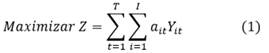 Donde la restricción (2) establece que la cantidad de instalaciones abiertas en T periodo de tiempo debe ser igual al valor p y la (3) establece que un nodo de demanda en un periodo t solo pude ser cubierto si se encuentra dentro del radio de cobertura S de al menos una instalación abierta en el mismo periodo t.