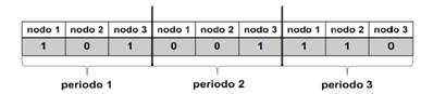 Aunque muchos enfoques diferentes pueden ser empleados para representar una solución de DMCLP, en este empleamos una representación de cadena binaria en el cual cada bit representa el estado del nodo (Zarandi et al., 2013), donde el valor 1 significa que esa instalación se encuentra abierta o disponible y 0 en caso contrario (Fajardo, 2015). La Figura 1 se muestra un esquema de representación de una solución para T períodos (Zarandi et al., 2013).