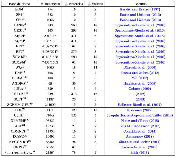 En la literatura se pueden encontrar desde bases de datos pequeñas (Yeh, 2007) a bases de datos con cientos de miles de instancias (Joaquín Torres-Sospedra and Trilles, 2014). La siguiente tabla permite observar la diversidad dimensional de algunas de las bases de datos que pueden ser utilizadas para MTR. En la primera columna se indica el nombre de la base de datos, la segunda se refiere al número de observaciones de la base de datos. La tercera y cuarta columna indican la cantidad de atributos en el espacio de entrada y salida respectivamente.