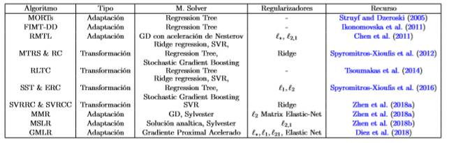 La siguiente tabla detalla una síntesis de los principales trabajos de MTR y su relación con los modelos de optimización y los métodos de solución empleados. Sobre esta base es posible extender los algoritmos de MTR al escenario de grandes volúmenes de datos.