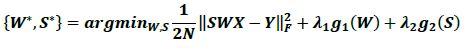 donde g1 y g2 representan el término asociado al regularizador para la matriz W y S respectivamente. Vale resaltar que en este contexto g1 y g2 pueden ser genéricos, permiten utilizar varios tipos de normas y son escalables a diferentes esquemas de regularización.