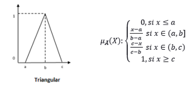 describe una función de partencia asociada a un conjunto difuso 𝐴̃ que depende no sólo del concepto que representa, sino también del contexto en el que se usa. Una función de pertenencia no es una función como la de los conjuntos clásicos, es necesario definirla. Cualquier forma de estas funciones tiene diferentes propiedades y representaciones gráficas. La semántica de los conjuntos difusos no es muy sensible a diferenciaciones en la forma, y es muy ventajoso el uso de funciones simples. Para la representación de los conjuntos suelen definirse con funciones paramétricas. En esta investigación, teniendo en cuenta la semántica, el contexto y dominio en que se utiliza, así como para lograr la simplificación el trabajo, se utiliza la función triangular.Figura 1