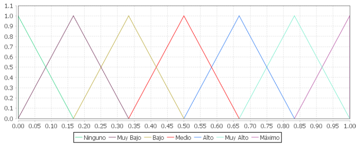 . De esta forma el conjunto de términos lingüísticos utilizado en las variables lingüísticas se encuentra formado por una estructura de etiquetas ordenadas de la siguiente manera: S0 = N = Ninguno; S1 = MB = Muy Bajo; S2 = B = Bajo; S3 = M= Medio; S4 = A= Alto; S5 = MA = Muy Alto; S6 = MX = Máximo. En este conjunto Si <Sj y sólo si