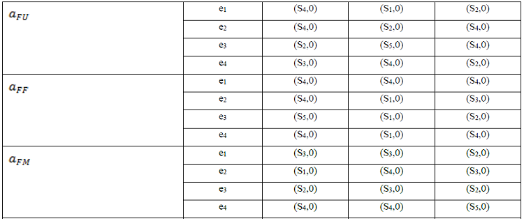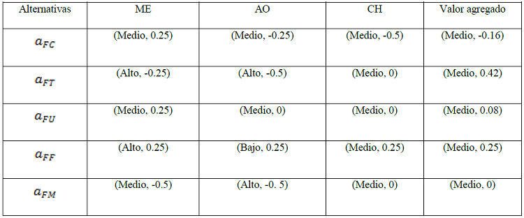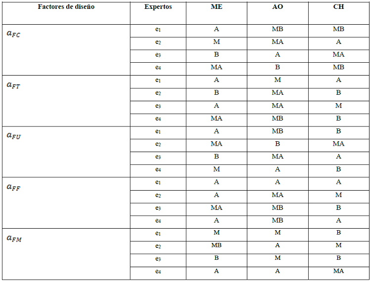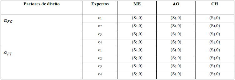 Los expertos expusieron sus valores de preferencias, los cuales fueron unificados y expresados en el dominio lingüístico de 2-tuplas. En la Tabla 1 se muestran las preferencias emitidas por los expertos para la evaluación de los criterios para cada una de las alternativas.