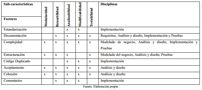 Reconociendo el impacto que tienen los factores de mantenibilidad sobre la calidad del producto de software. Se realizó una clasificación de estos, teniendo como referencia los modelos presentados por los autores (Rodríguez, 2015; Erazo, 2015; Irrazábal, 2015; Erazo, 2016). Primeramente, los factores se relacionaron de acuerdo a su influencia en las sub-características de mantenibilidad planteadas por la Norma Cubana ISO/IEC 25010: 2016 (NC ISO/ IEC 25010, 2016). Tomando como referencia las definiciones tanto de los factores como de las sub-características a las que afectan. La segunda parte de la clasificación se efectuó vinculando los factores con las disciplinas ingenieriles: Modelado de negocio, Requisitos, Análisis y diseño, Implementación y Pruebas, como se puede observar en la Tabla 1.