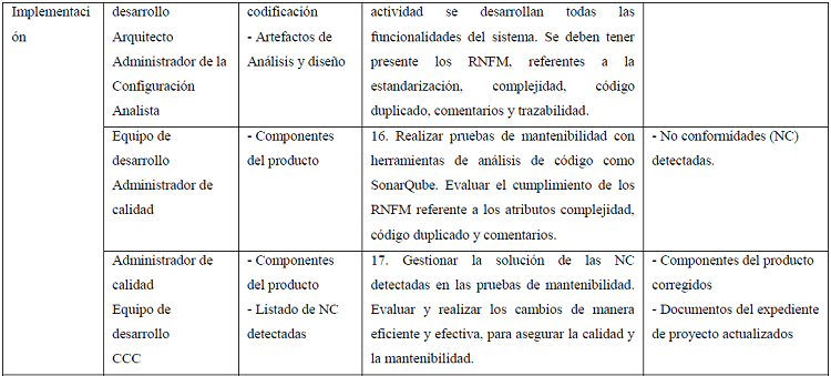 Después de identificados los requisitos surgieron las actividades encaminadas al cumplimiento de estos. Las actividades junto a los roles, los artefactos de entrada y salida, forman en su conjunto el proceso para la gestión de la mantenibilidad que se describen a continuación.