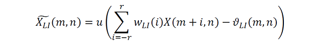 Donde n y m representan el tiempo y la frecuencia en la que se encuentra indexada la señal. wLI es una máscara con un patrón específico y un conjunto de pesos. Para máscaras de orden 3x3 (r=1), los pesos son w-1 = w1 =− 1 2 y w0 =1. u . es una función de activación no lineal (paso unitario o sigmoide) que se activa cuando el valor resultante supera un umbral específico 𝜗 𝐿𝐼 𝑚,𝑛 . Para las pruebas experimentales del presente trabajo se consideró con valor nulo el umbral.
