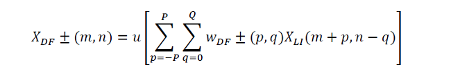 Los campos receptivos que detectan las frecuencias ascendentes o descendentes de los formantes, mediante plantillas de máscaras, corresponden a la ecuación que transforma la entrada 𝑋 𝐿𝐼 𝑚,𝑛 en las respectivas salidas 𝑋 𝐷𝐹 +(𝑚) y 𝑋 𝐷𝐹 − 𝑚 . Siendo m el orden respectivo de las bandas de frecuencias que se están buscando, y el signo + o - se refiere al sentido positivo o negativo de la pendiente. En el caso específico que se muestra en las simulaciones, las dimensiones de las matrices de los pesos 𝑤 𝐷𝐹 ±(𝑝,𝑞) son 9x9, lo que significa que la conectividad en frecuencia se extiende desde +4 hasta -4 neuronas vecinas.