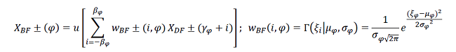 donde 𝜑 es el índice del formante, 𝛾 𝜑 y 𝛽 𝜑 son los índices de la frecuencia central y la mitad del ancho de banda. Los pesos de la suma 𝑤 𝐵𝐹± se seleccionan para reproducir la probabilidad de salida del formante de acuerdo con la función de densidad gaussiana, siendo 𝜇 𝜑 y 𝜎 𝜑 la media de la banda y la desviación estándar, −𝛽 𝜑 Ω≤ 𝜉 𝑖 ≤ 𝛽 𝜑 Ω; ?? 𝑖 =𝑖Ω; 𝜇 𝜑 = 𝛾 𝜑 Ω; 𝜎 𝜑 = 𝛽 𝜑 Ω.