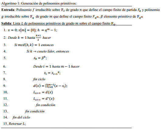 Otras interesantes propuestas son los algoritmos propuestos en (Shoup, 1999) y en (Di Porto, Guida, Montolivo, 1992), ambos están basados en la teoría de los registros de desplazamiento y las sucesiones recurrentes lineales. No obstante, existe otra vía teórica relacionada con la generación de polinomios primitivos basada en la obtención de los cosetos q-ciclotómicos y la construcción de polinomios mínimos (Gordon, 1976) (Lidl, Niederreiter, 1994) (Shoup, 2009) (Shoup, 1999) que permite un sencillo acople con cualquier esquema de software y un costo computacional razonable. En (Rifà, Borrell,1995), cuya propuesta posee la mejor complejidad, se utiliza una idea similar, pero desde un punto de vista de hardware.
