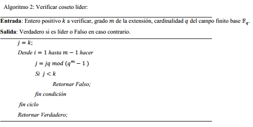 Un problema común es construir cosetos q-ciclotómicos repetidos. Para minimizar la ocurrencia de este caso se verifica para cada k si es coseto líder, puesto que el coseto líder es el menor de los elementos del coseto q- ciclotómico. Para realizar el paso 4 del algoritmo y determinar si un entero positivo k es un coseto líder se utilizó el siguiente algoritmo.