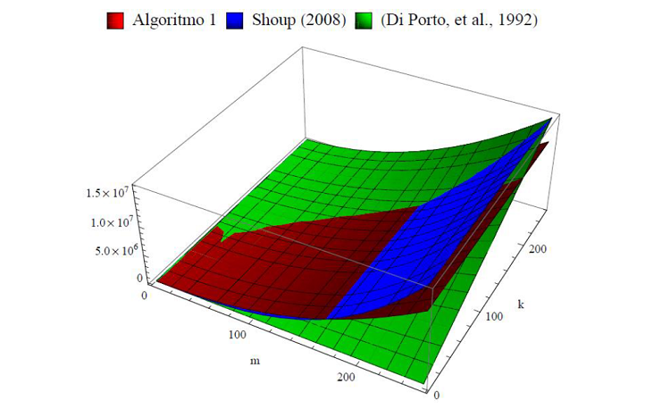 Se observa como existen valores de m y k a partir de los cuales el costo computacional del Algoritmo 1 es inferior a los casos (Shoup, 2009) y (Di Porto, Guida, Montolivo, 1992). Estos resultados muestran la importancia de seleccionar adecuadamente el valor de k en (Di Porto, Guida, Montolivo, 1992).