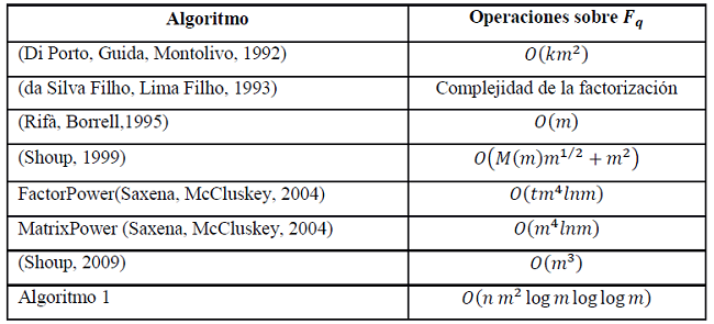 de grado menor que m. En tal representación el costo de ejecución del Algoritmo 1 está dado por O(m log q M) operaciones sobre Fq, donde M es el costo en operaciones de la multiplicación. Utilizando el mejor método de multiplicación (Schönhage, Strassen, 1971), con