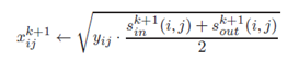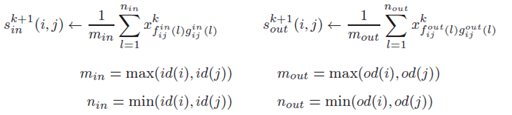 Donde fijin y gijin son las funciones de enumeración de la correspondencia óptima de los vecinos de entrada (si un grafo contiene una arista de i a j , el nodo i es llamado vecino de entrada del nodo j ) para los nodos i y j , de forma análoga para fijout y gijout . Los términos id(i) y od(i) se refieren respectivamente a los grados de entrada y salida del nodo i. Encontrar la correspondencia de los elementos de A y B de mayor peso es un problema de asignación, que puede ser resuelto a través del algoritmo húngaro, aunque existen otros más eficientes. La matriz de similitud [xij] refleja la similitud de los nodos de dos grafos A y B . La similitud de los grafos se define como el peso de la correspondencia óptima dividido por el número de pares en la correspondencia: