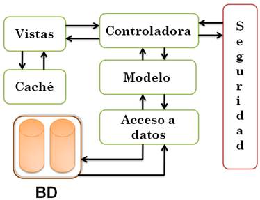 La aplicación utiliza una arquitectura Cliente-Servidor, utilizando como estilo arquitectónico una variante del patrón Modelo-Vista-Controlador (MVC) (ver Figura 3). La variante basa su funcionamiento en las especificaciones descritas por el patrón MVC, pero se le agrega una capa adicional del lado del cliente llamada Caché (Teruel, 2011). Esta capa caché se utiliza para la persistencia de los datos del lado del cliente, lo cual garantiza que todas las interacciones de la aplicación se realizan sin tener que interactuar con el servidor, por lo que el tiempo de respuesta de la herramienta es mejor.
