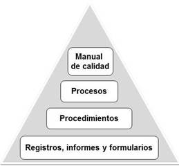 Diseñar el sistema de gestión: Para llevar a cabo esta actividad, debe considerarse el modelo de calidad a implantar a partir de la NC- ISO/IEC 9126-1:2005, así como los resultados del diagnóstico realizado en la fase anterior. Debe definirse la estructura documental del sistema de gestión, así como la pirámide documental presentada en este trabajo según cuatro niveles jerarquía (Figura 2). Posteriormente, debe diseñarse la estructura del repositorio en el que deben archivarse y gestionarse los documentos que se definan. Se propone en la presente investigación que sea un repositorio digital utilizando la herramienta Subversion y que la información se organice en ocho áreas de trabajo: Administración, Bibliografía, Documentos externos, Documento obsoletos (almacenamiento histórico), Procedimientos del sistema de gestión y Procesos claves, estratégicos y de apoyo. Para concluir esta actividad, se debe definir la política de calidad, los objetivos de calidad y actualizar el organigrama del laboratorio si es necesario.